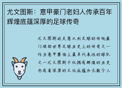 总的来说,尤文图斯作为意甲的豪门俱乐部,凭借其深厚的历史积淀、卓越的竞技表现以及忠实的球迷群体,已经成为了世界足球的一座丰碑。尤文图斯的百年辉煌不仅仅是一段段的比赛成绩,更是一个足球文化传奇的传承。